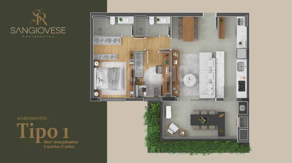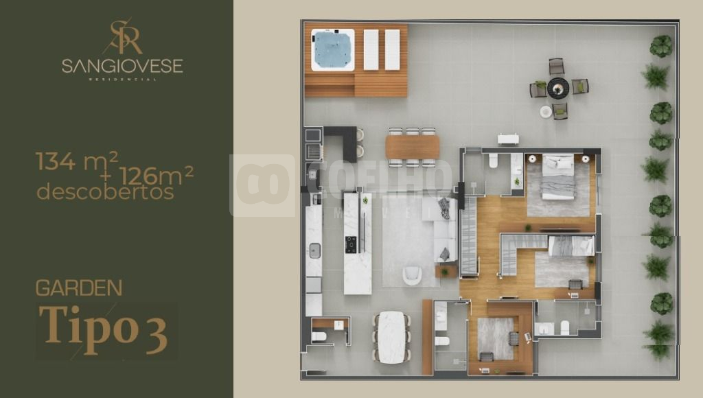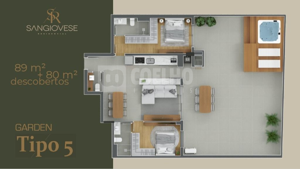 As metragens variam de 88 m² a 220 m² com opções de garden e cobertura duplex.
