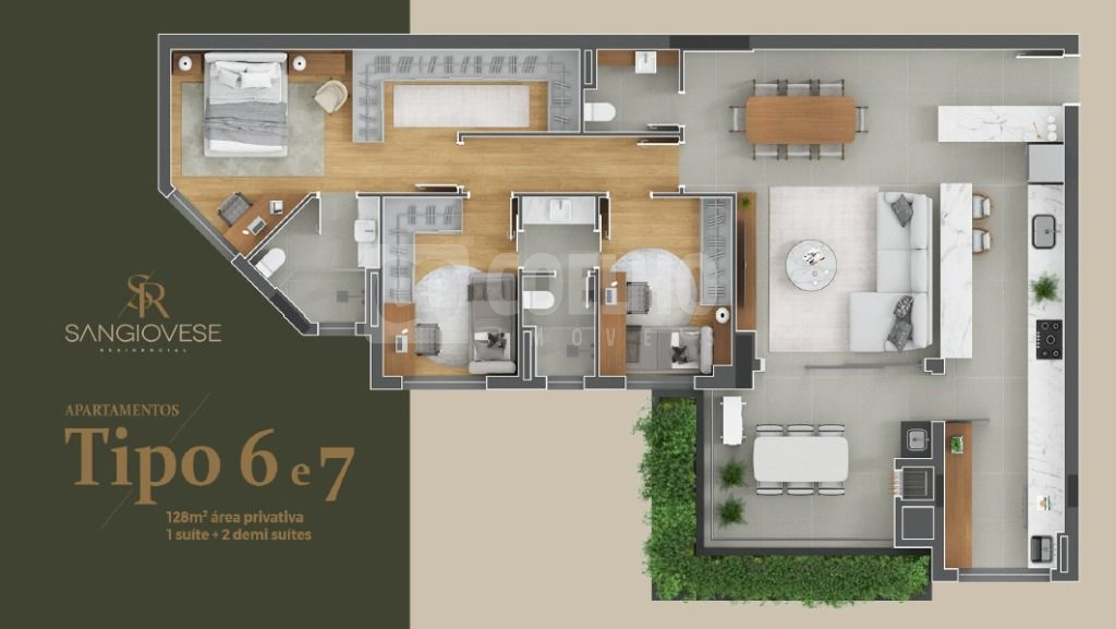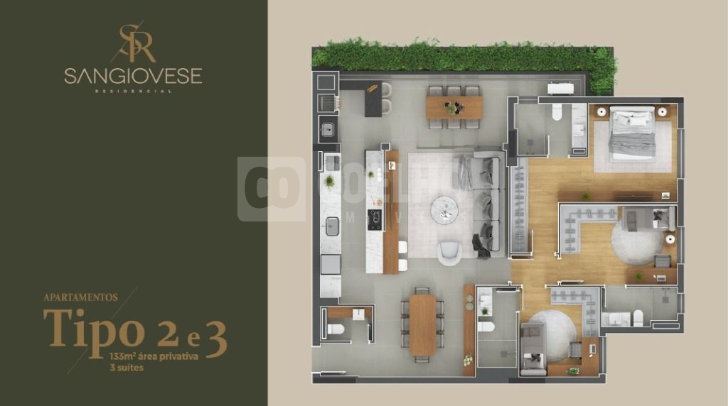 Os apartamentos contam com 2 ou 3 suítes, além da opção de 1, 2 ou 3 vagas de garagem.