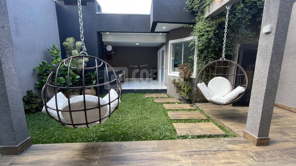 - Quintal com balanços tipo cesto e jardim suspenso na entrada lateral